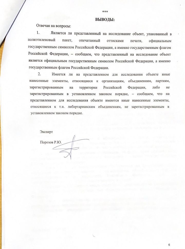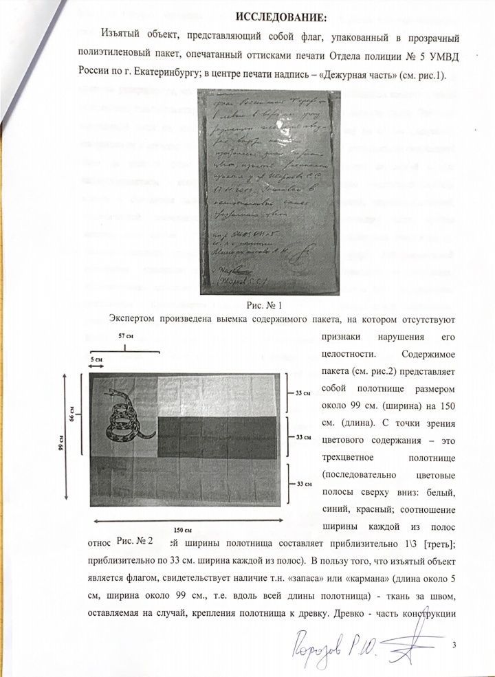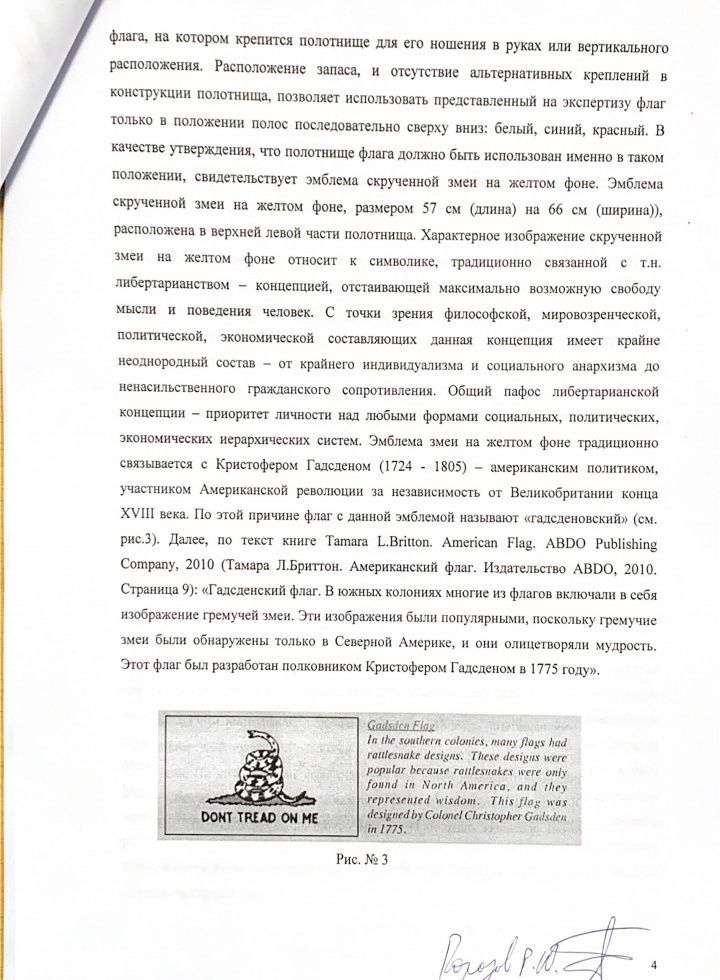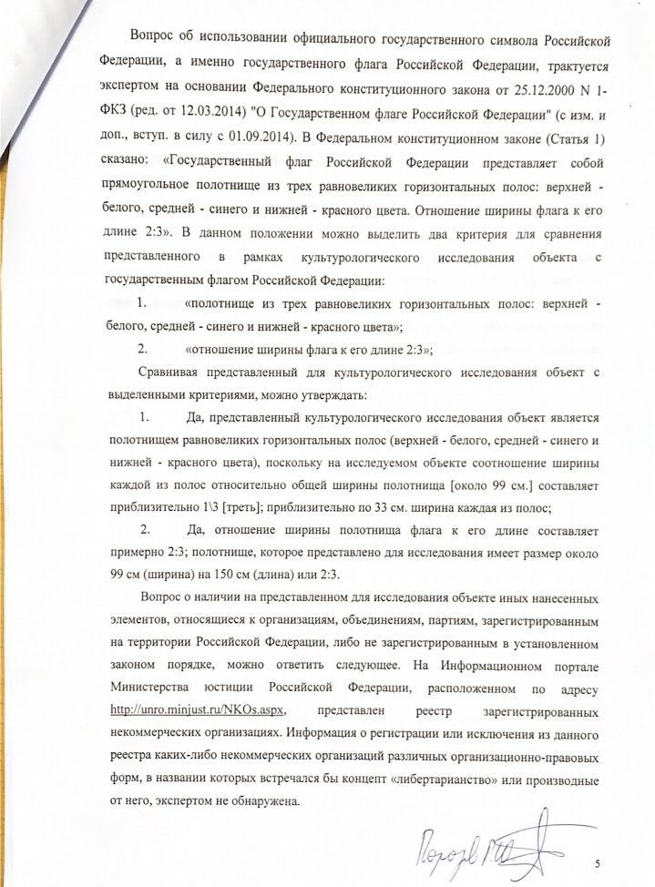 Экспертиза подтверждает нарушение ФЗ о флаге, что совершенно не так: использование гражданами Государственного Флага РФ, его изображения, допускается в том случае, если использование не является надругательством над ним. Таким образом, обвинение по 17.10 КоАП несостоятельно.