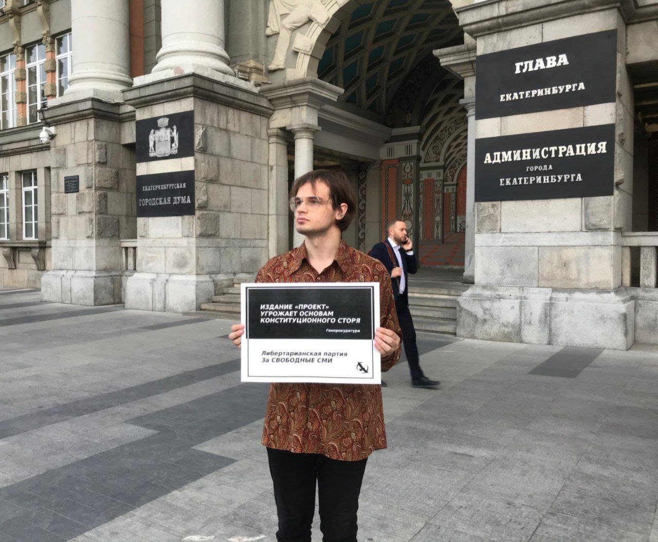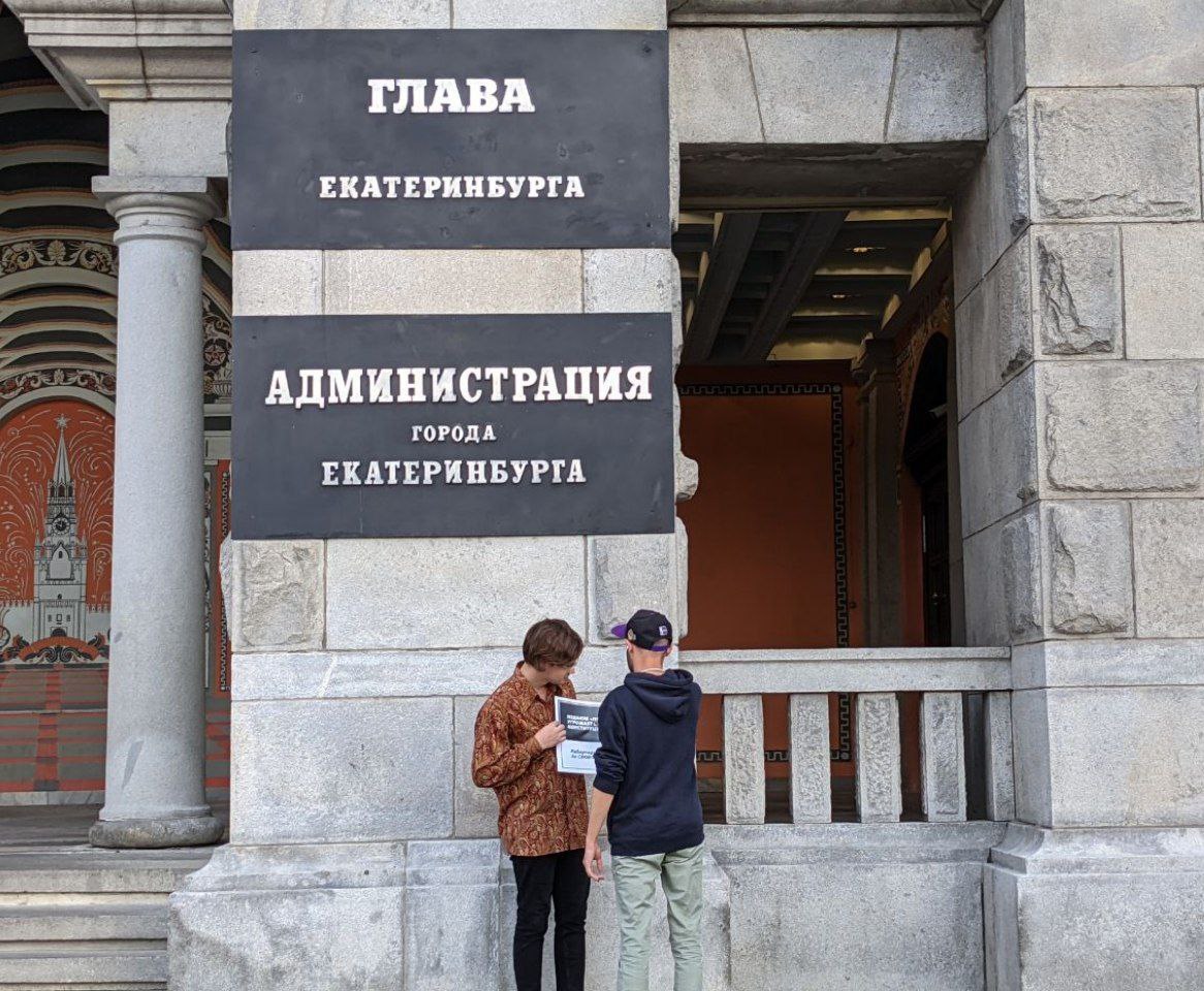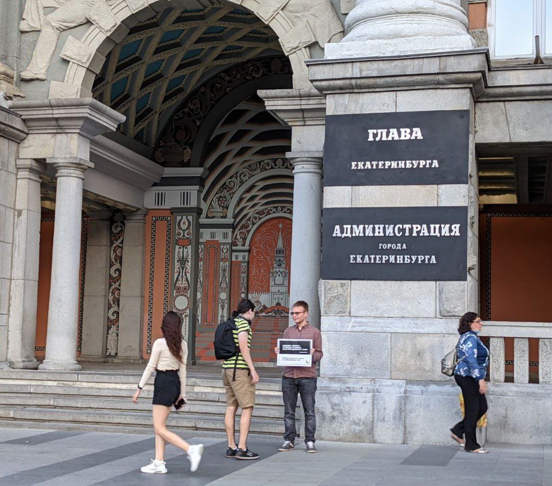 Члены нашего отделения Матвей Голованов и Сергей Аблеев вышли в пикет возле здания администрации Екатеринбурга, чтоб поддержать журналистов. Сотрудники администрации не препятствовали пикету.